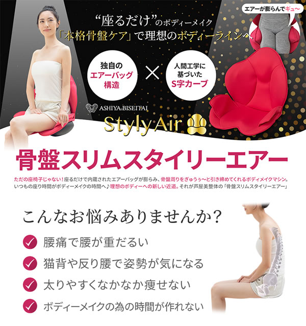 商品詳細 商品名 芦屋美整体 骨盤スリムスタイリーエアー 商品説明 人気骨盤矯正サロン・芦屋美整体の納富亜矢子先生監修。