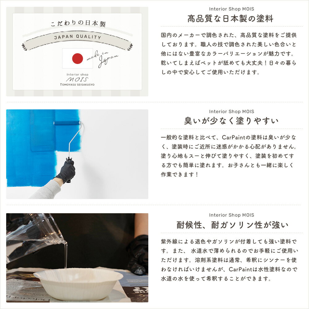 Interior Shop MOIS臭いが少なく塗りやすい 一般的な塗料と比べて、CarPaintの塗料は臭いが少なく、塗装時にご近所に迷惑がかかる心配がありません。