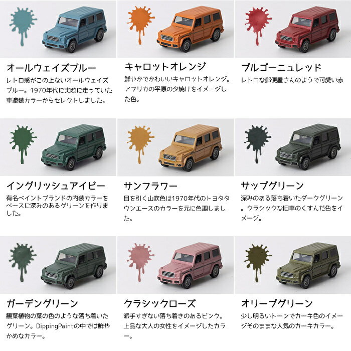 1kg 2kg 3kg 4kg 6kg(3kg×2) 8kg(4kg×2) おすすめの単色カラー おすすめのセットカラー Dippin' Paint -Car Paint-誰でも手軽に車の全塗装が楽しめる、車用塗料! 車の塗装をしたいけど、プロに依頼したら値段は高いし時間がかかる・・・それなら、自分で簡単に安く車塗装したい!!そんなあなたに、自分で車を刷毛やローラーで全塗装してみませんか?!自分だけのオリジナル!世界に一つだけの車が作れます。