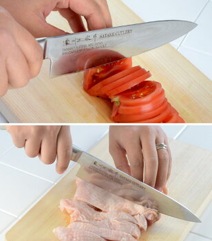 柔らかいトマトも、鶏肉の皮もスッと切れる刃先を当てるだけで、柔らかくて切りにくいトマトも、気持ちいいぐらいにスッと切れます。